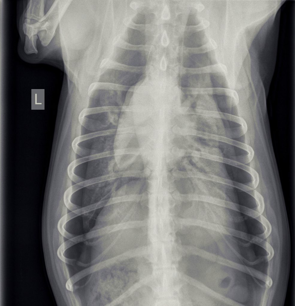 Echter, de dag erna bleek ze toch te verslechteren, ze werd benauwder en kwam voor controle bij ons. Bij het onderzoek viel op dat ze inderdaad benauwd was, dat ze iets blauw gekleurde slijmvliezen had en er waren te weinig longgeluiden te horen voor zo’n benauwde hond.
