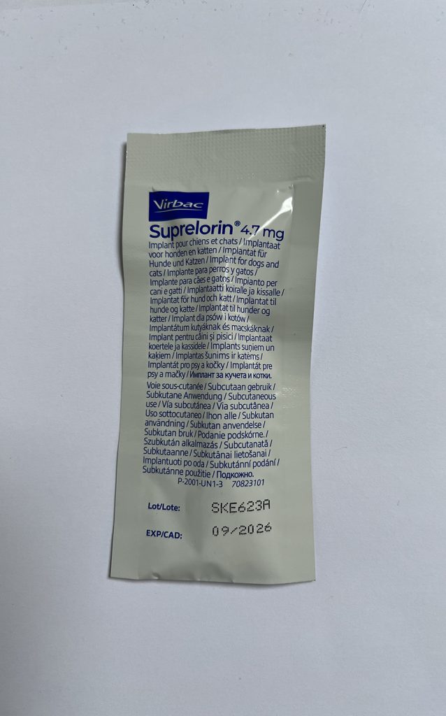 We hebben Mees eerst in slaap gebracht met gasnarcose. Hierna hebben we de plek voor het implantaat voorbereid. Vervolgens hebben we het Suprelorin implantaat geplaatst. Daarna hebben we Mees weer rustig wakker laten worden.