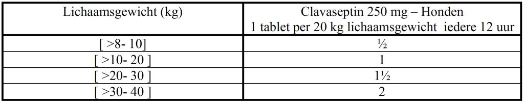 Bij honden mag in geval van ernstige infecties, de dosering verhoogd worden tot 20 mg amoxicilline/5 mg clavulaanzuur/kg lichaamsgewicht tweemaal daags.