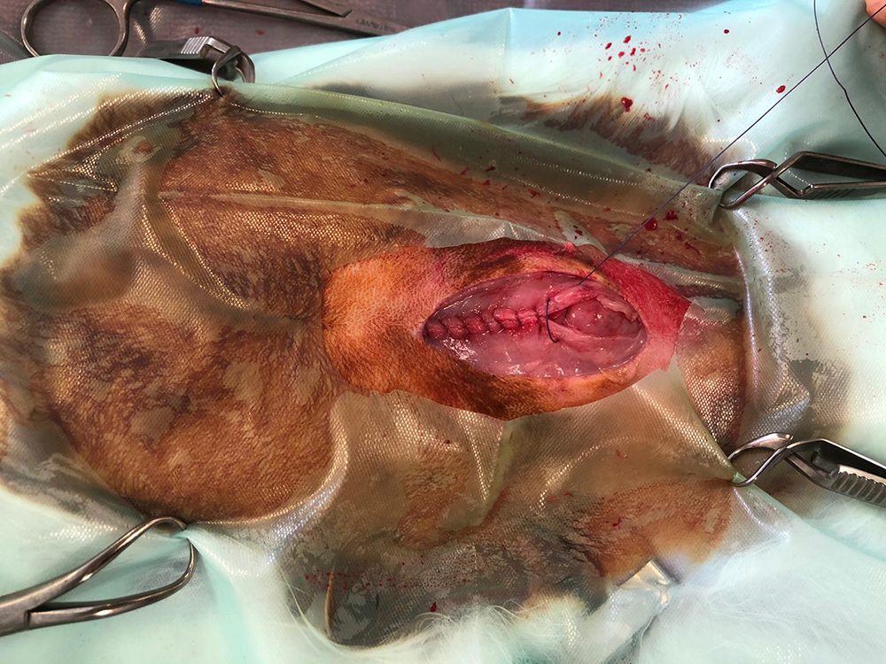 Hierna worden de buikwand, de onderhuid en de huid gesloten. Vaak is het weefsel heel dun waardoor het hechten lastig kan zijn. Het is zaak om de hechtingen goed onder de huid te krijgen.