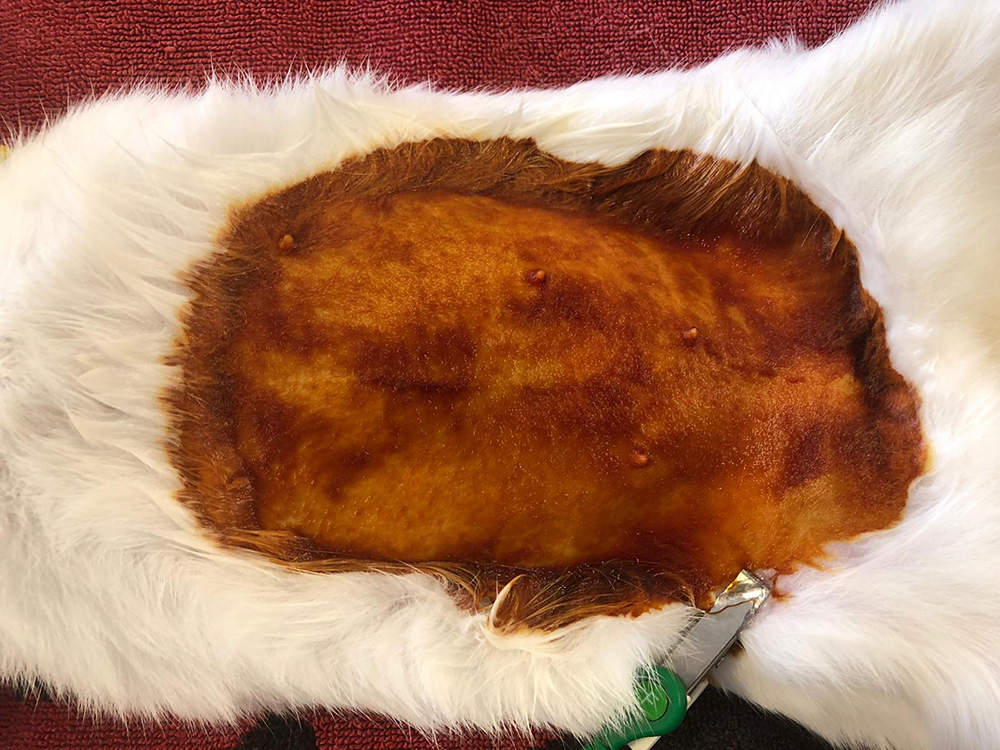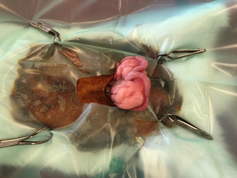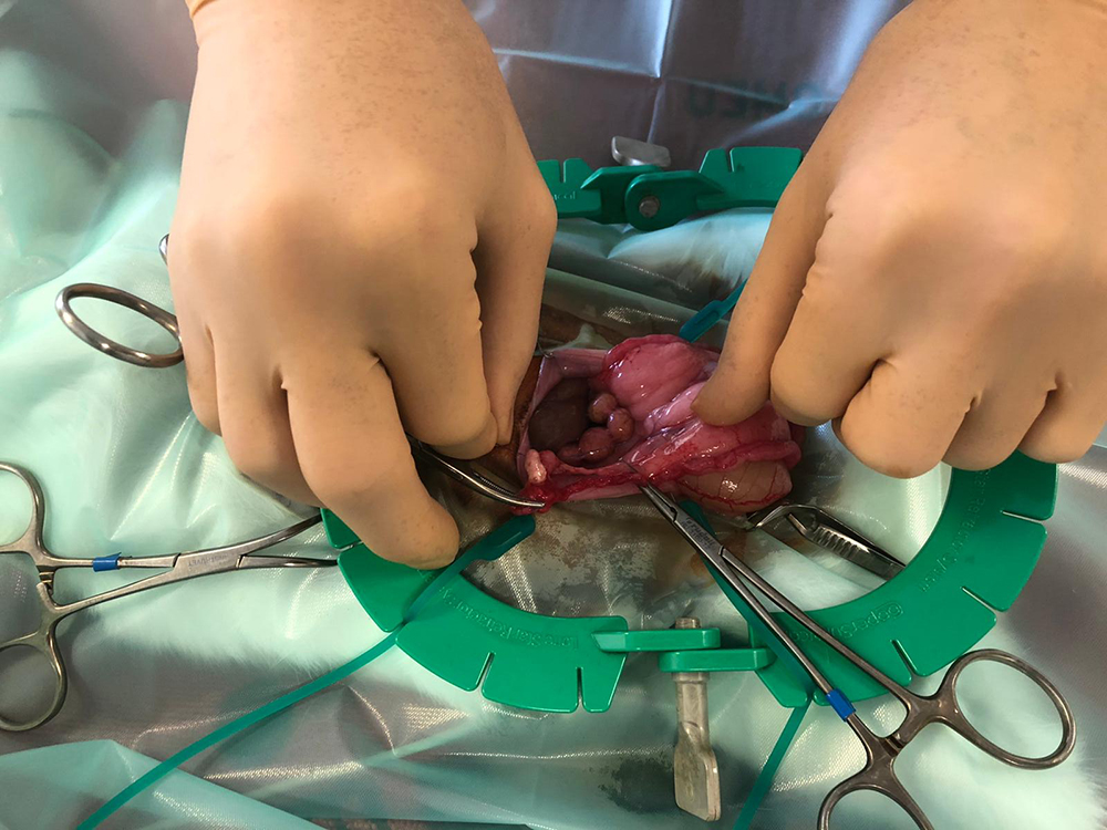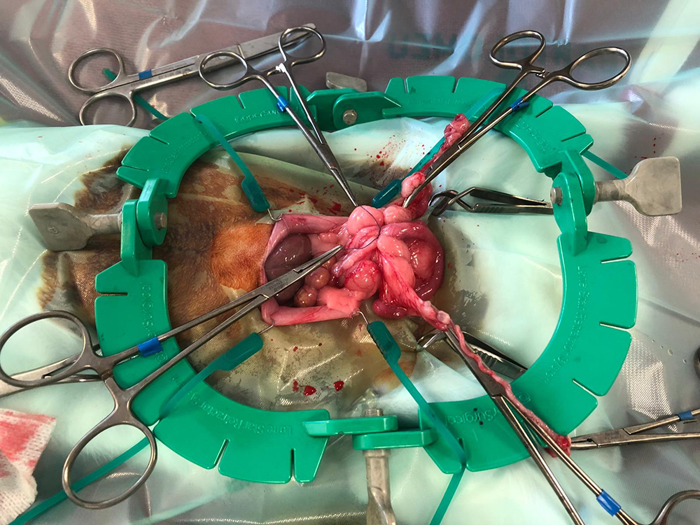 Nu kan de buik geopend worden, tot vlak voor het bekken. Om de buik open te houden, wordt de “lone star retractor” geplaatst. Hiermee is er goed zicht en werkruimte te verkrijgen. De eierstokken liggen bij het konijn vrij ver naar de zijkant, de darmen liggen vaak in de weg en zijn erg fragiel. Met de “lone star retractor” kan de sterilisatie veiliger worden uitgevoerd.