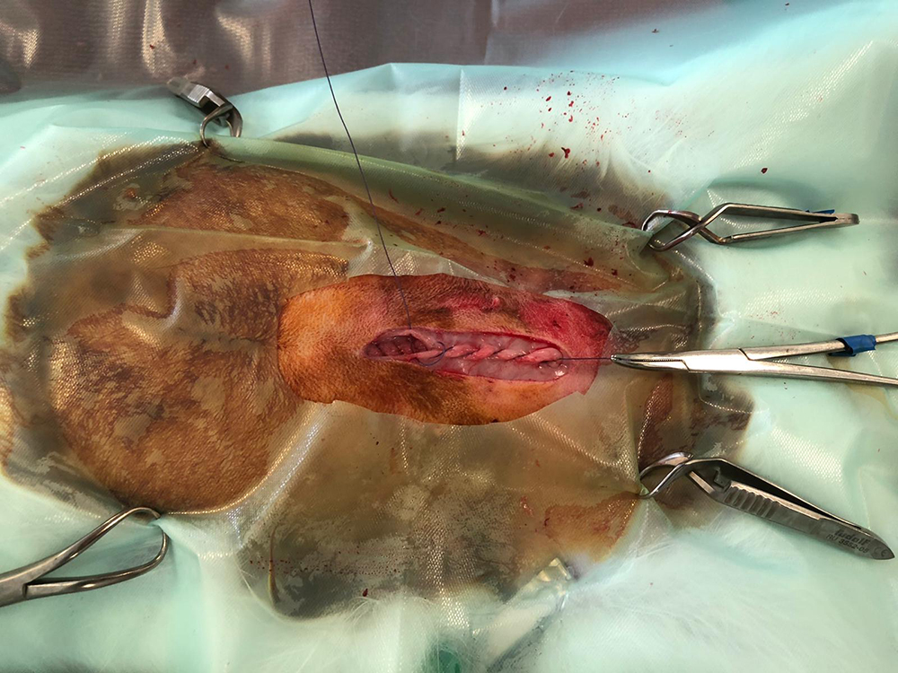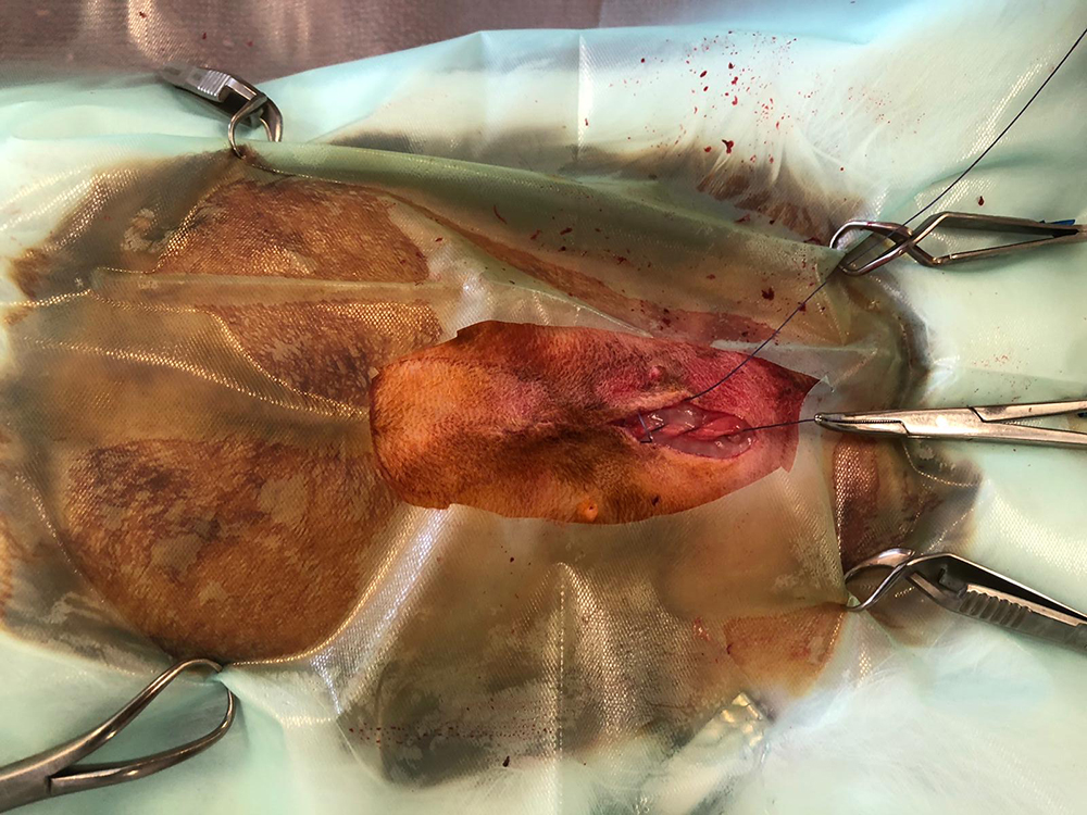Nadat de voedster de narcose gehad heeft en in slaap is gevallen, wordt ze geschoren in de voorbereidingsruimte. Hierna gaat ze naar de operatiekamer, waar er een buisje (een V-gel, larynxmasker) in de keel wordt ingebracht. Zo kunnen we zuurstof en slaapgas toedienen en tevens de ademhaling monitoren, met behulp van een capnograaf.