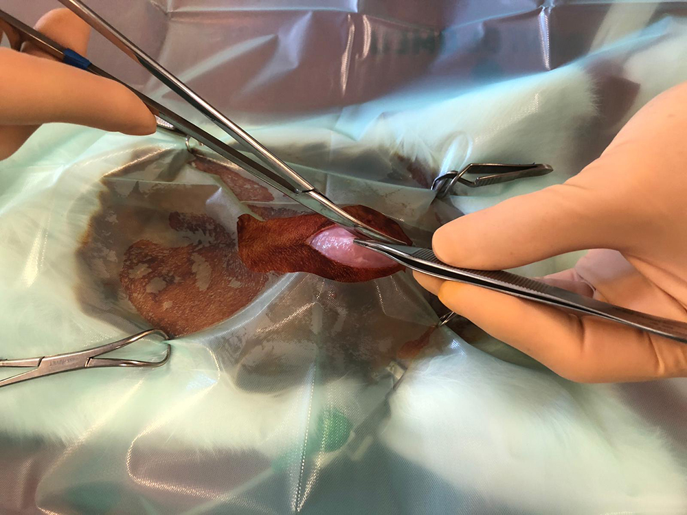In de operatiekamer trekt de chirurg steriele handschoenen aan en wordt het konijn met een steriele doek bedekt. Vervolgens wordt het chirurgische instrumentarium klaargelegd.