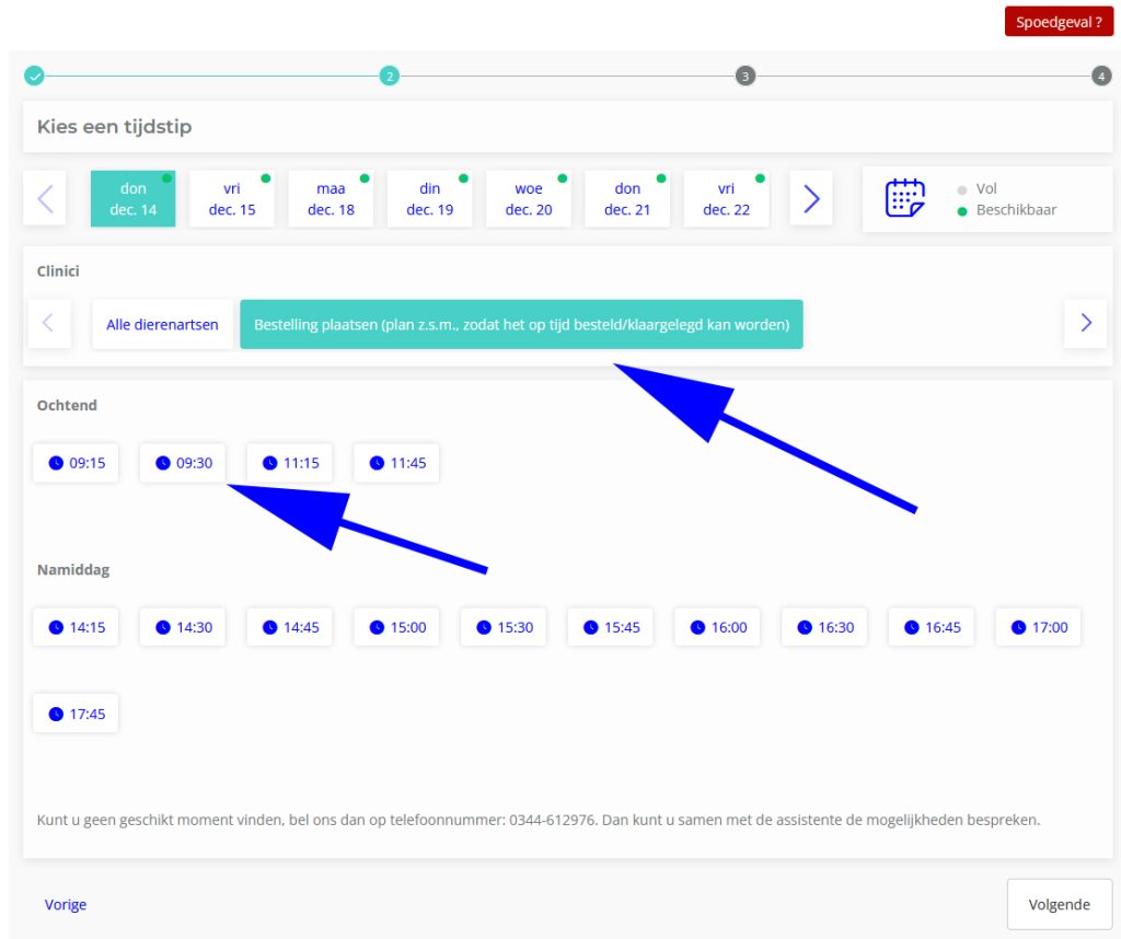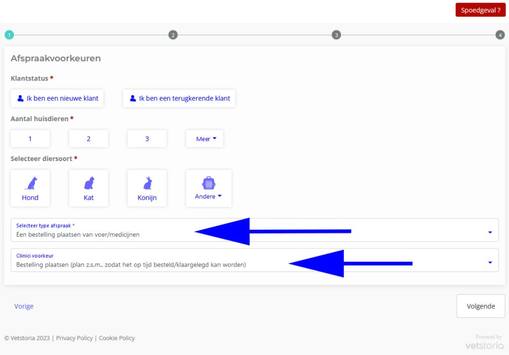 - Bij het type afspraak kiest u de onderste mogelijkheid: “Een bestelling plaatsen van voer/medicijnen”.