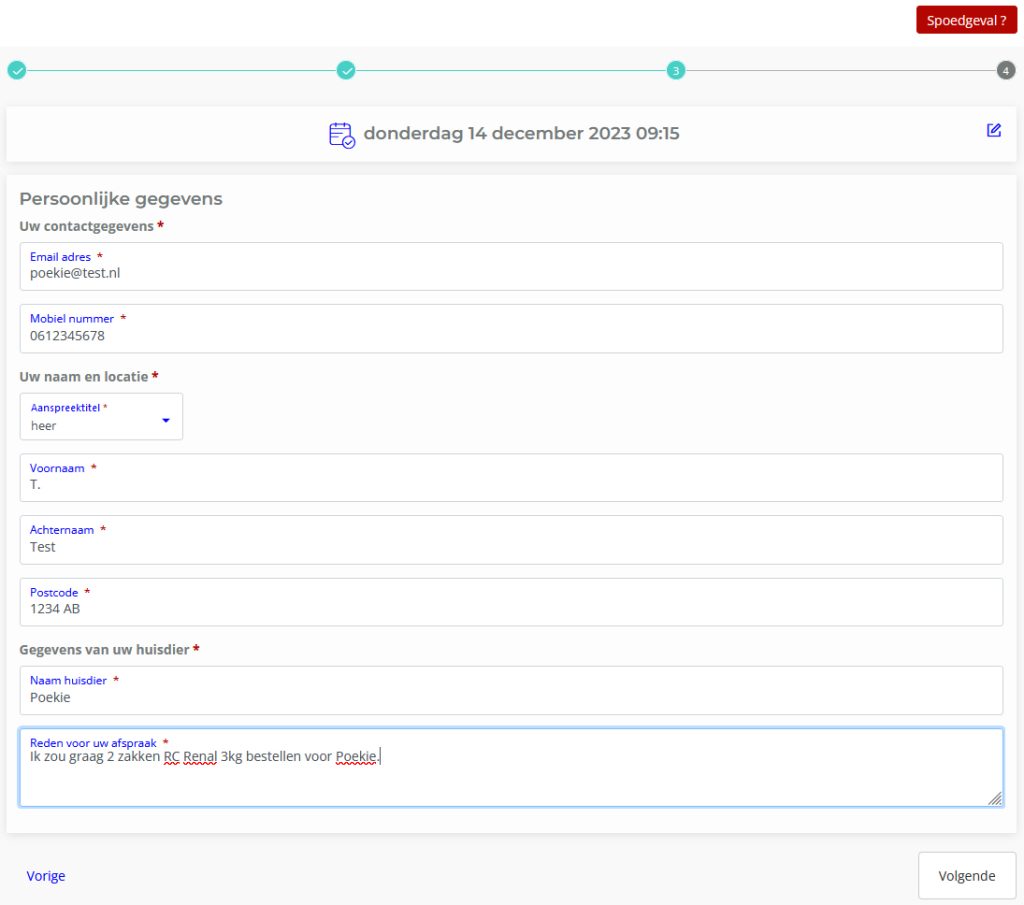 - Dan vult u de persoonlijke gegevens in, zodat we weten voor wie de bestelling is. Bij de reden voor uw afspraak kunt u aangeven welk product u wilt bestellen.